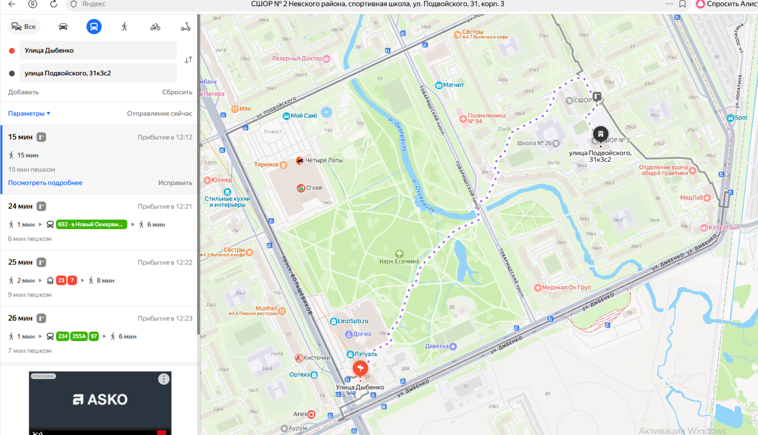 При выходе из транспорта повернуть на лево и пройти до арки между домами Товарищеский пр. д. 22 корпус 1 и ул. Подвойского д.29, корпус 1. Расстояние составляет 92 метра, далее при входе в арку проходим прямо вдоль девяти этажного дома до конца. Расстояние 240 метров.